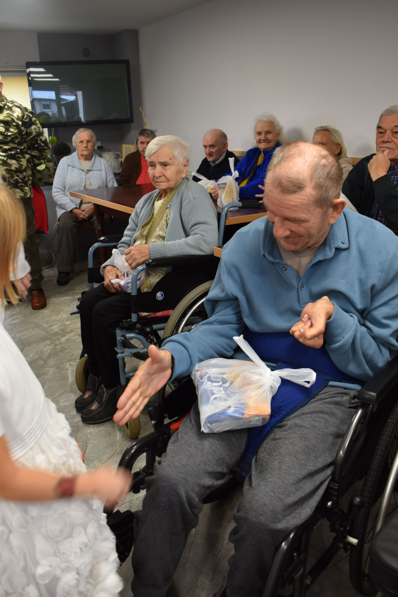 Dzieci w formie wystepu złożyły Mieszkańcom świąteczne życzenia i wręczyły zebrane przez Społeczność Przedszkola kawy i ciastka.