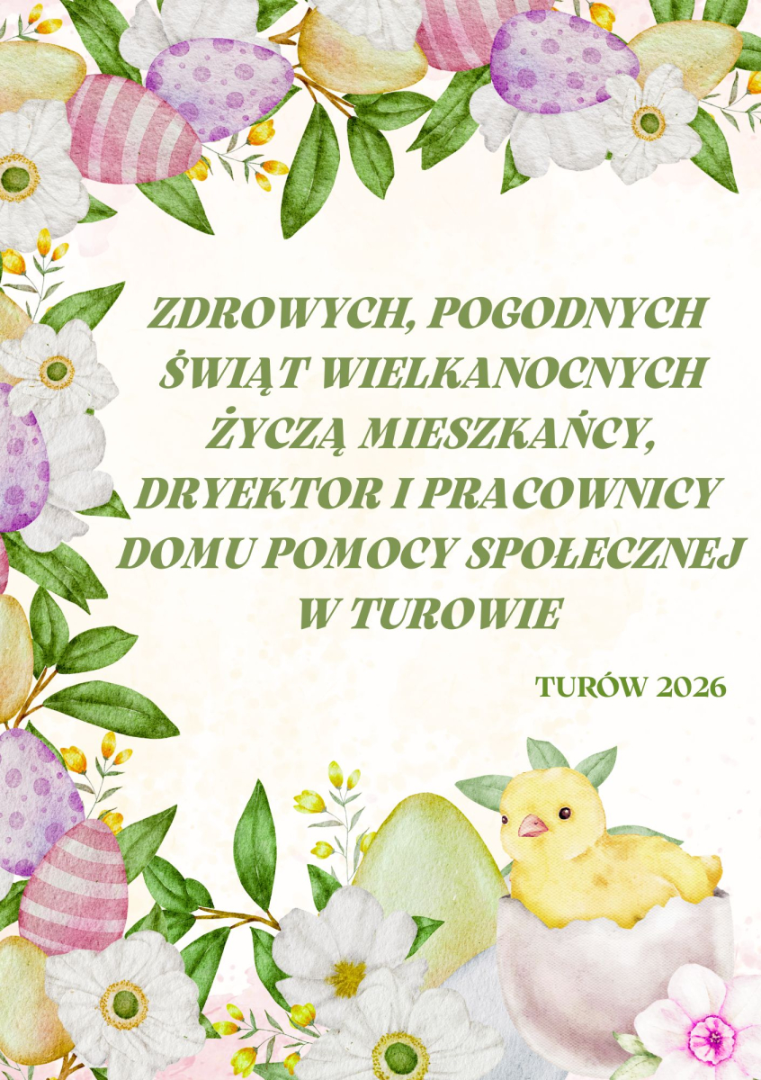 ZDROWYCH, POGODNYCH ŚWIĄT WIELKANOCNYCH ŻYCZĄ MIESZKAŃCY, DYREKTOR I PRACOWNICY DOMU POMOCY SPOŁECZNEJ W TUROWIE.
